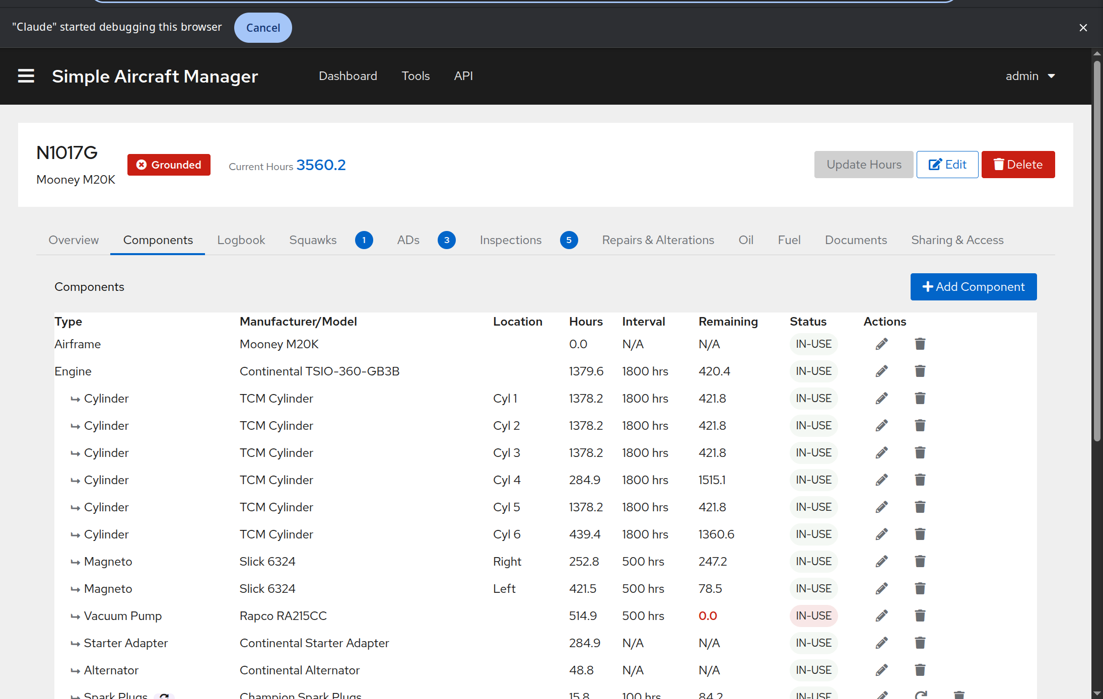 The Components tab tracks all installed parts and assemblies on the aircraft, along with their service intervals and remaining life.