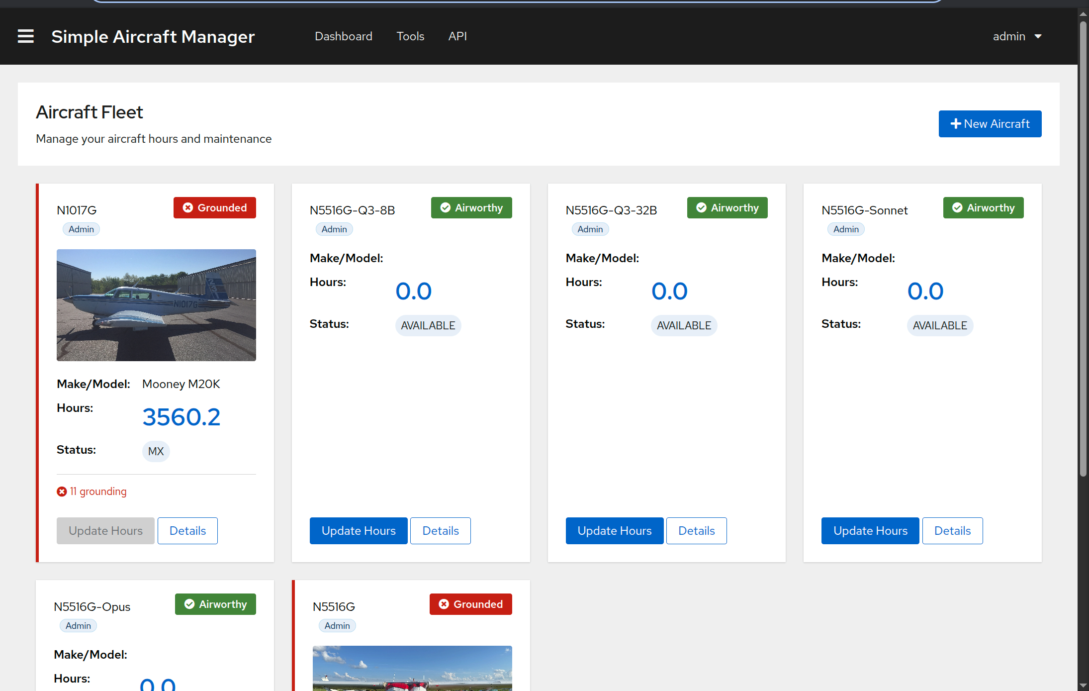 The dashboard is the main landing page after login. It shows all aircraft you have access to as a grid of cards.