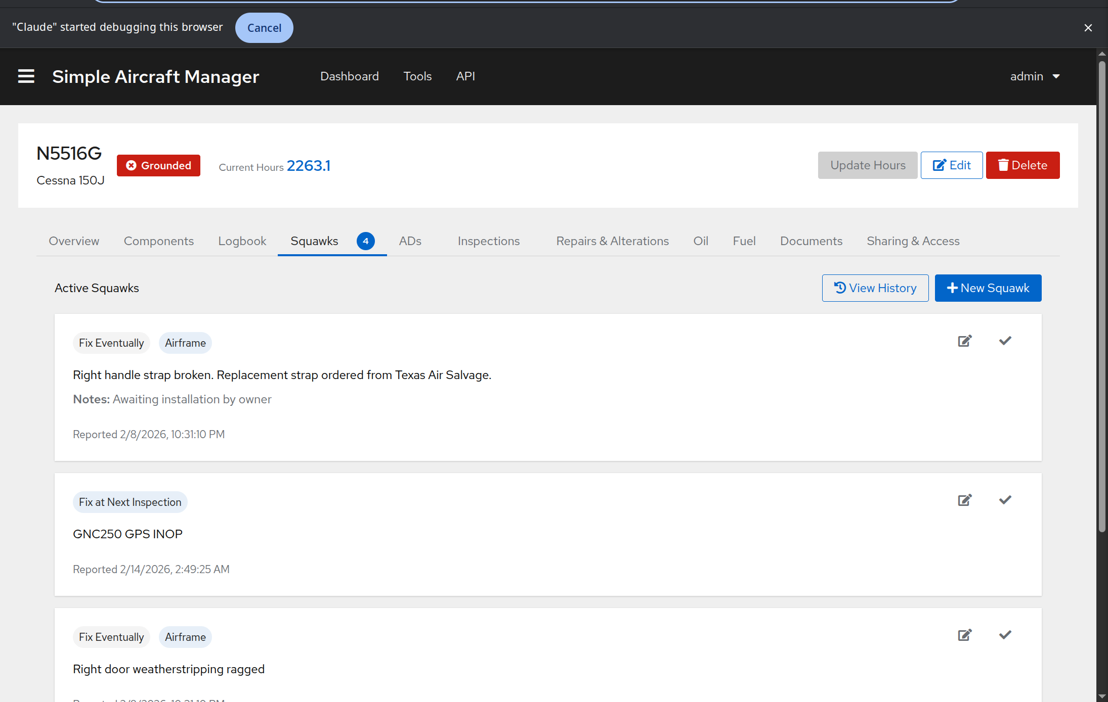 Squawks are maintenance defects or issues reported on the aircraft. They are tracked on the Squawks tab and factor into the aircraft’s airworthiness status.